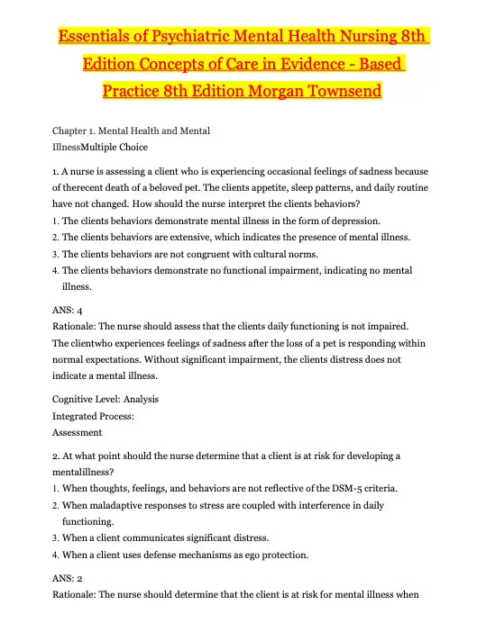 Test Bank Essentials of Psychiatric Mental Health Nursing 8th Edition: Concepts of Care in Evidence by Morgan Townsend